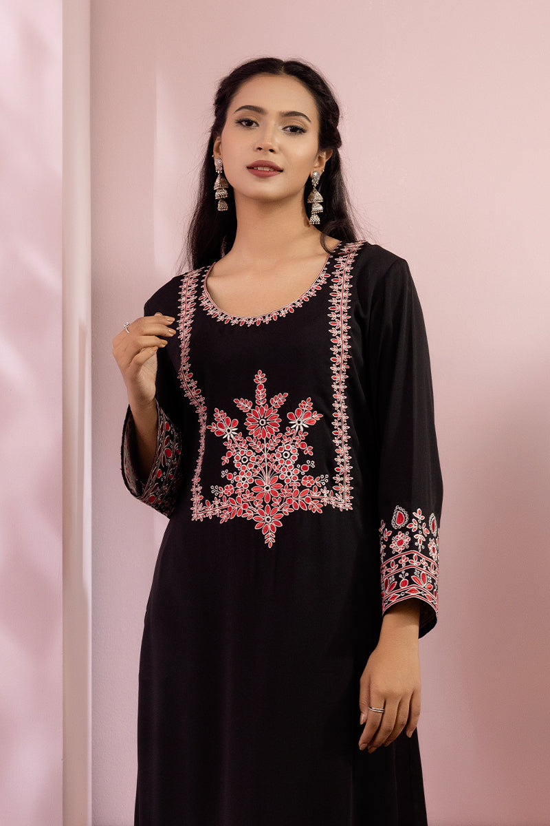 Embellishment: Floral motif embroidery on the neckline & sleeve. Embroidery with white & red color thread.