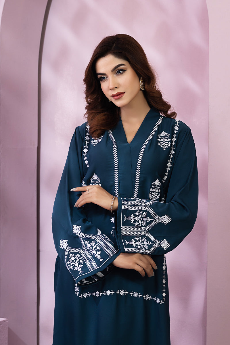 Embellishment: Heavy embroidery on the neckline, daman & sleeves. Embroidery with white color thread. Kaftan Neck.