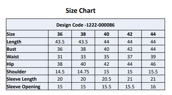 Embellishment: Embroidery on the full body, neckline & sleeves. Embroidery with white color thread.